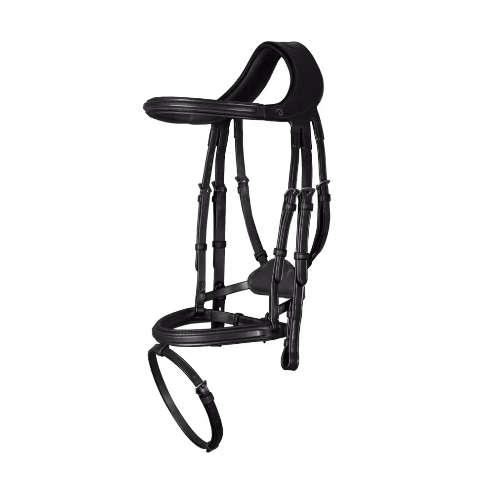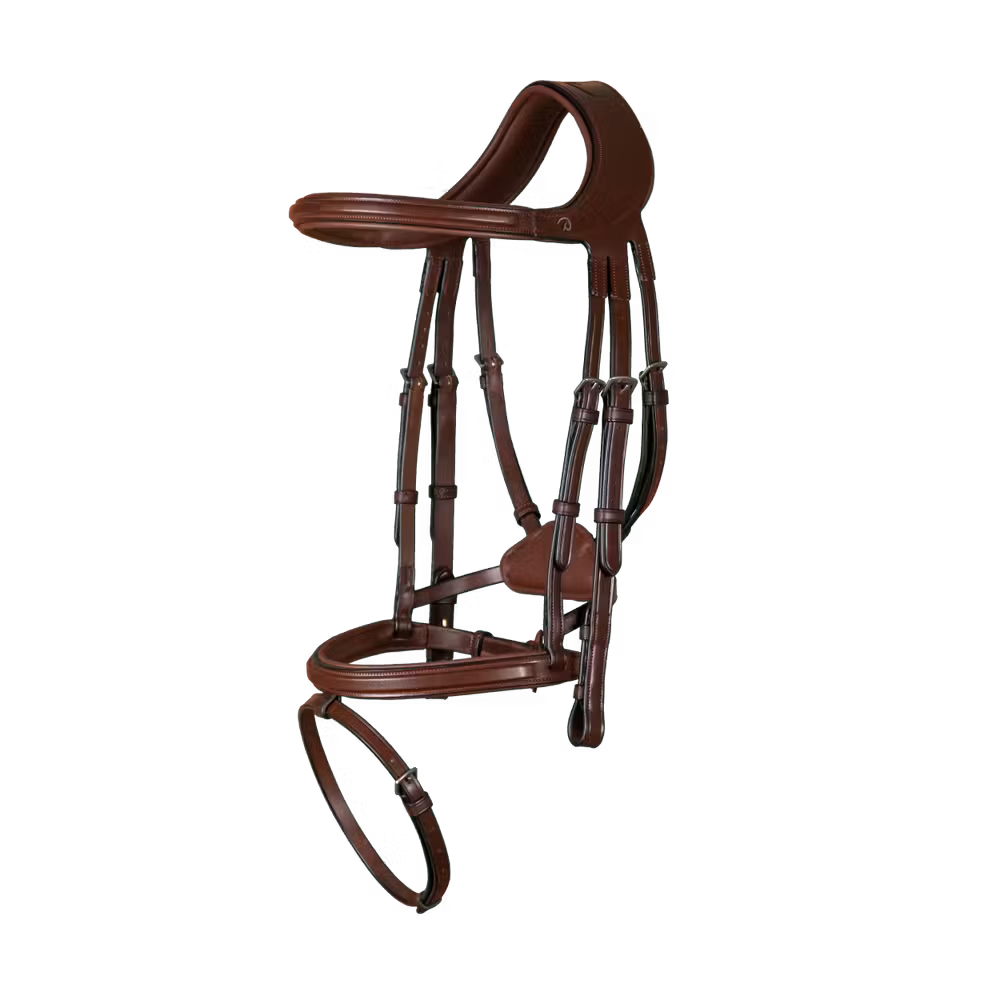 This bridle is engineered with anatomicalprecision, ensuring an optimal pressure-free fit for sensitive horses. Byshifting the headpiece away from the ears, it reduces poll pressure, while the throatlatch-to-nosebandconnection maintains stability without restricting movement. Made from high-qualityDy’on leather, this bridle provides the perfect balance of comfort, durability,and functionality for horses in need of a specialized fit.