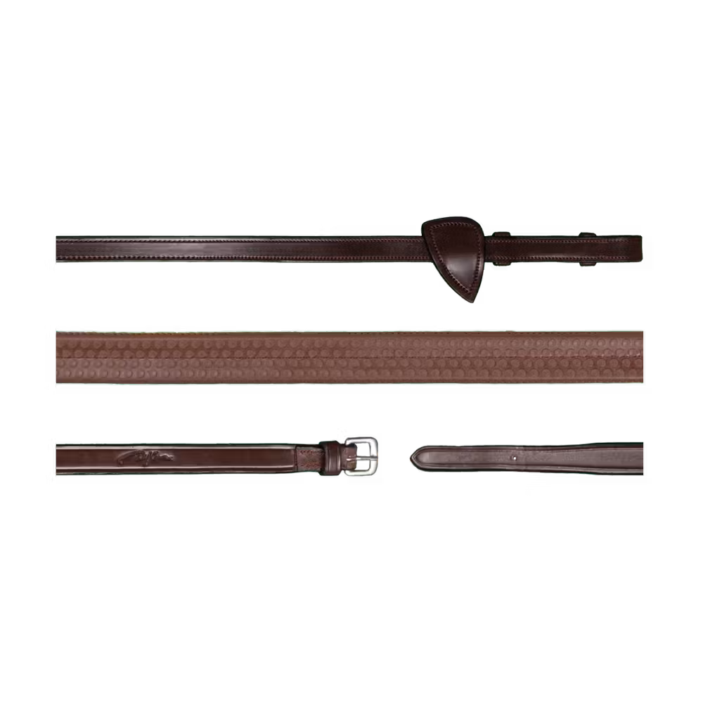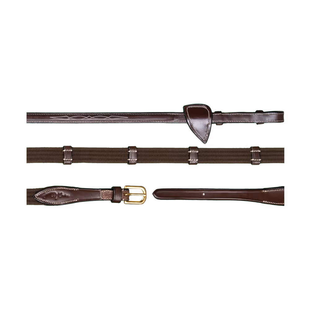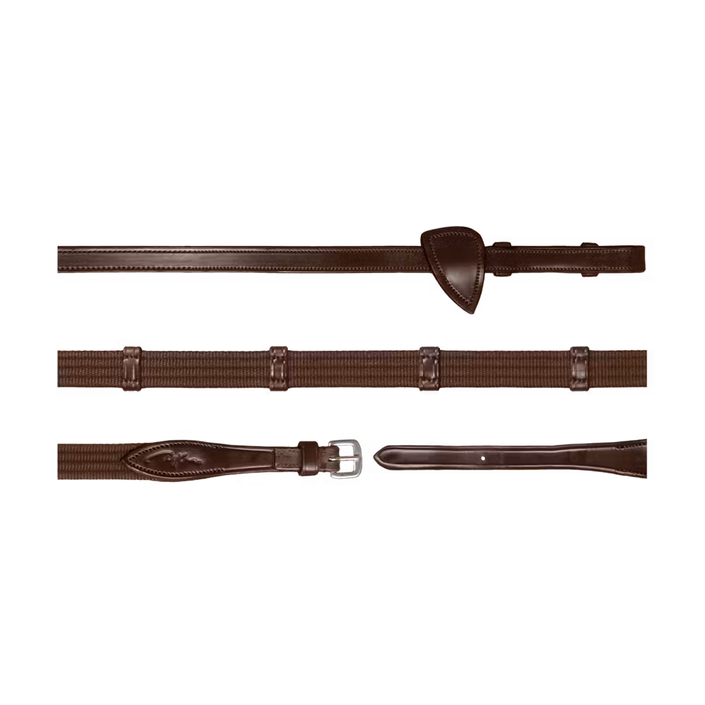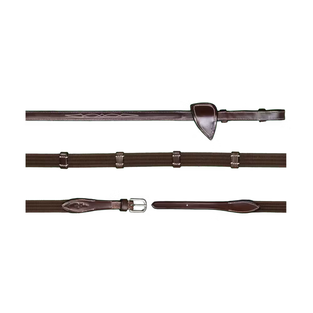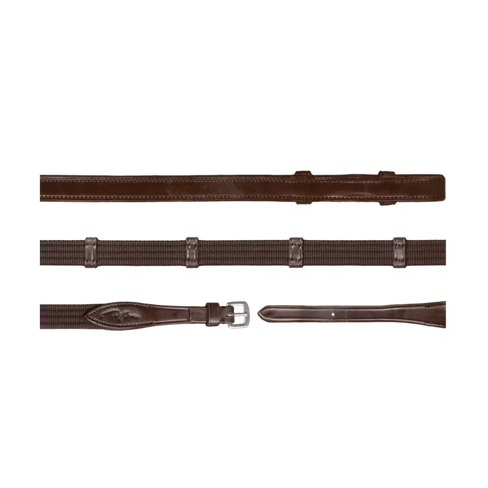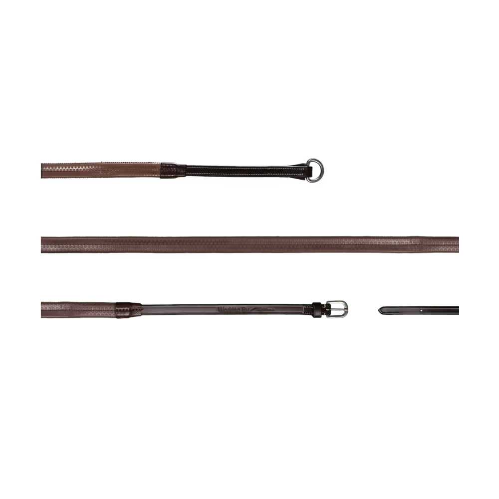 Rubber reins 1/2u2019u2019 with 7 leather stops, ring closur WO coll, Full/brown
